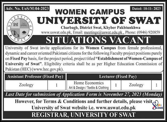 through the prescribed application form. In these University Of Swat Jobs 2023 the