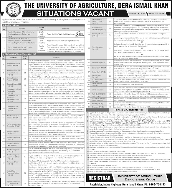 The University Of Agriculture Jobs 2024 has been recently announced in the advertisement of The Express Newspaper by the Government of Pakistan. Applications from eligible people are invited through the online website. In these Latest The University Of Agriculture Dera Ismail Khan Jobs 2024 the eligible candidates from their respective regions can apply through the organization-defined process and can get these latest Jobs in Pakistan 2024 after the full recruitment process.